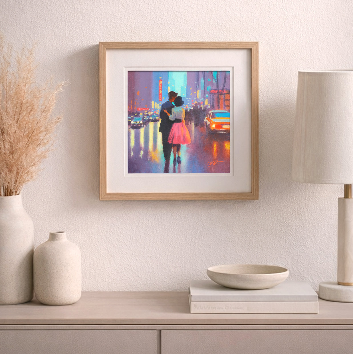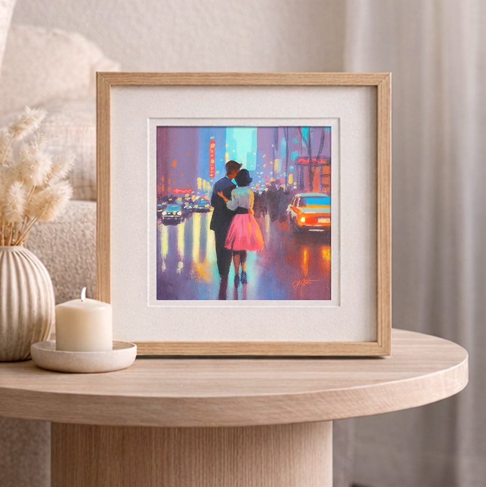 At first glance, this painting captures a couple walking through a glowing city street, reflections shimmering on rain-soaked pavement. But look closer — the storm has already passed.The deep reflections beneath their feet hint at what came before. The rain. The weight. The unseen chapters that shaped this moment.